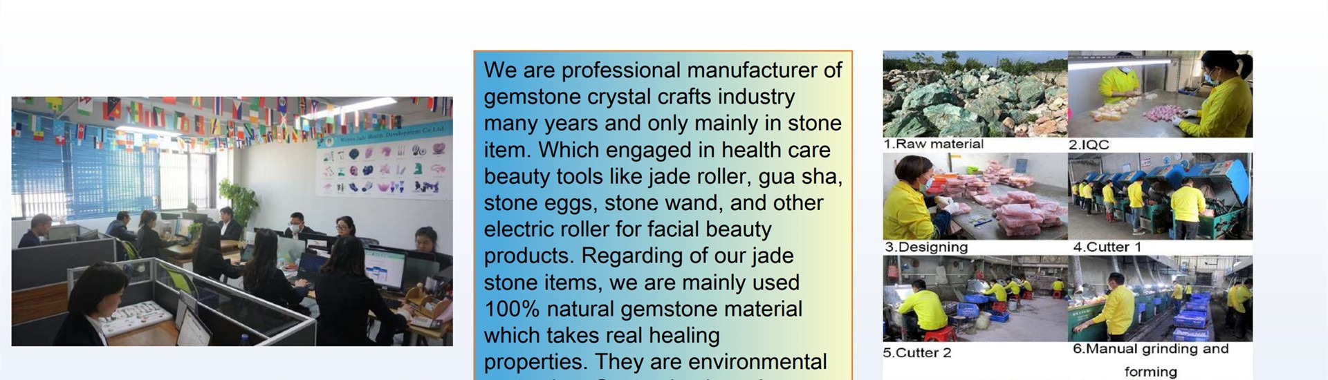 주요 제품:크리스탈 공예, 옥 구샤와 롤러, 크리스탈 보석, 크리스탈 동물 조각, 크리스탈 요니 계란